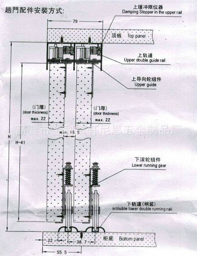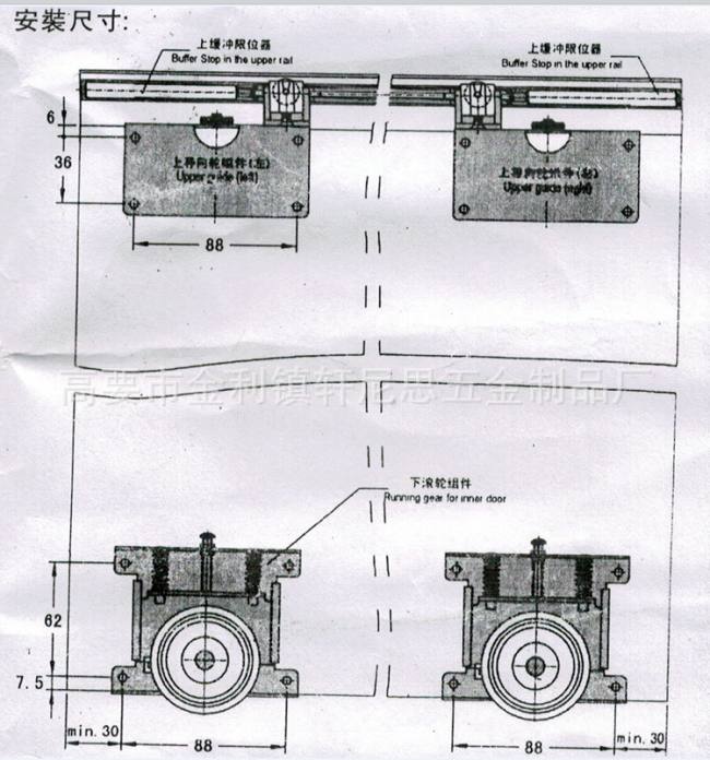 一套液压缓冲趟门轮是由:两只上导向轮,两只下滑轮轮,两支缓冲器,一支上轨道,一支下轨道组成。
