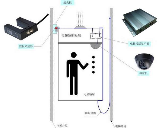 电梯楼层叠加器的工作结构示意图如下,只是增加一套光电采集设备和在原网络系统中接入叠加器。