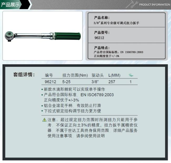 注意:超过规定扭力范围时所测扭力只能用于参考,不保证正向±3%的精度。扭力扳手属于精密仪器,不属于世达工具终身保用范围,详细产品服务使用注意事项,请参世达扭力扳手96212阅使用说明。