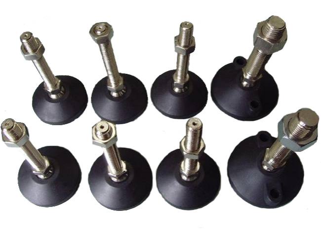 国家标准配件,非标准的可定做。铁脚盘调节脚: 碳钢镀锌螺杆, 铁皮包橡胶底盘固定蹄脚,底盘直径规格有40D及55D,螺杆长度及大小规格多任选。可调蹄脚螺丝 :碳钢镀锌 ,不锈钢,非标加工(支撑脚/关节蹄脚/橡胶脚蹄/万向可调脚)螺丝规格多种: M8 M10 M12 M16 M20 长度:50mm, 60 mm,80mm,100mm,150mm
