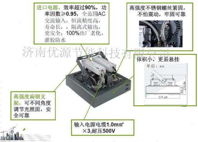 1:采用进口4头60颗大功率高流明单颗光源,LED光源全部采用全自动固晶焊线封装无铅波峰焊接工艺生产,灯具寿命≥50000小时