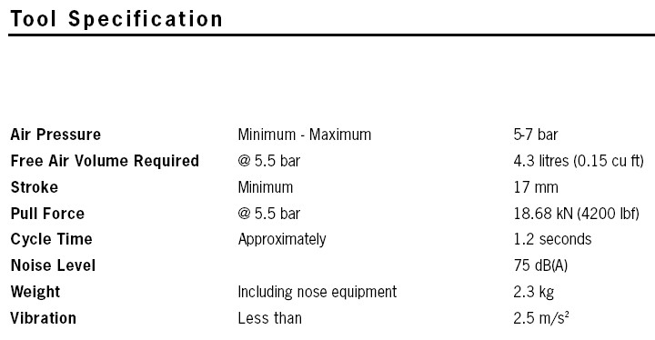 铆接范围:6.4mm以内的抽芯铆钉,也适用于Avseal?12mm密封塞等,重量:2.3kg.5.5bar气压下的拉力:18.68kN.最小行程:17mm.周期:1.2秒.平衡气压:5-7bar.5.5bar气压下气体容量:4.3L.