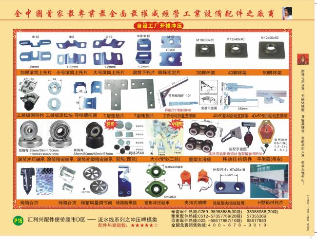 生产可调脚杯,各种规格脚杯,不锈钢脚杯,风批吊轮,牛眼,不锈钢牛眼,万向球,福来轮,注塑机避震脚,家具可调脚,铝合页,铁合页,暗插销,门拉手,铝角码,镀锌角码,脚轮,多种塑胶福来轮(规格:48mm/38mm),五金福来轮(规格:48mm/38mm),尼龙65三组一套拖轮,尼龙80mm拖轮,塑胶铝材封盖(规格:30*30小孔,30*30大孔,40*40小孔,40*40大孔,30*60,40*80,28*40方盖,铝材卡码,紧固件,滚筒托片,防震脚......等工业流水线设备配件。