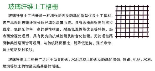 供应玻纤格栅规格南京直销格栅图片质优价低 产品有强度高,伸长率低,耐高温,模量高,重量轻,韧性好,耐腐蚀,寿命长等特点,可广泛应用于旧的水泥路面,机场跑道的维修,堤坝,河岸,边坡防护,道桥路面增强处理等工程领域,可给路面增强,补强,防止路面车辙疲劳裂纹,热冷伸缩裂纹和下面的反射裂纹,并能将路面承载应力分散,延长路面使用寿命,高抗拉强度低延伸率,无长期蠕变,物理化学稳定性好,热稳定性好,抗疲劳开裂,耐高温车辙,抗低温缩裂,延缓减少反射裂缝。