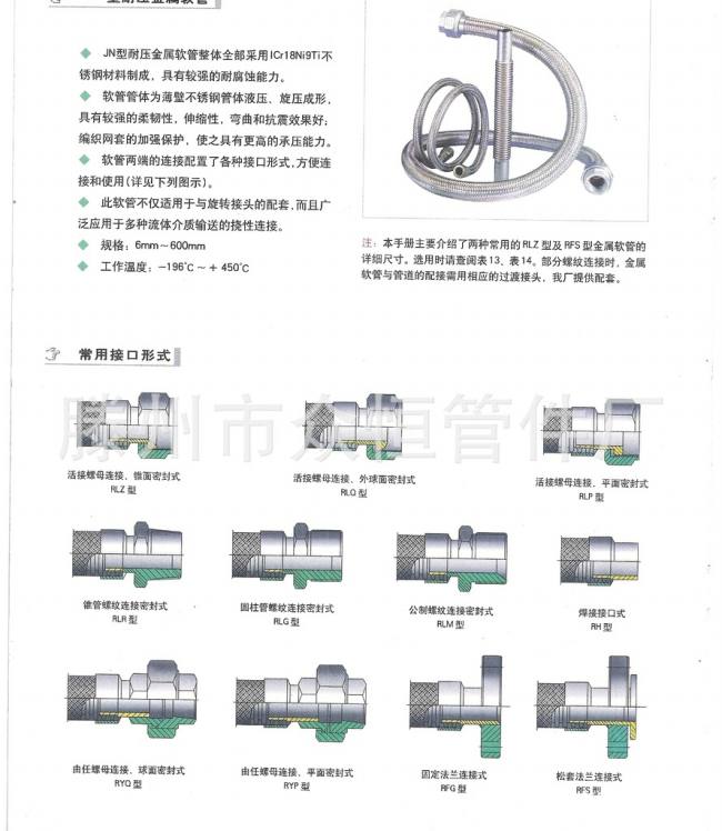·较管两端的连接还可以·软管管体为薄壁无缝不锈钢,具有较强的柔韧性,弯曲和抗振效果好;编织网套的加强保护,便之具有更高的承压能力. ·管液压旋压成型金属软管整体全部采用ICr18Ni9Ti不锈钢制成除螺纹,法兰标准型之外的其它连接方式.