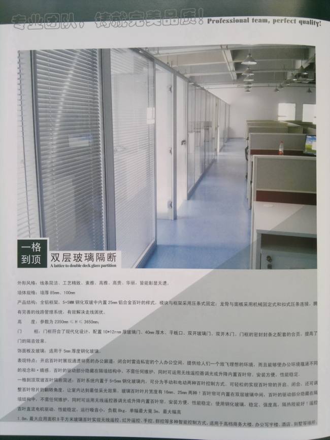 表现特点:开启百叶时展现通透明亮的办公廊道;闭合式雷造私密的个人办公空间,提供给人们一个放飞理想的办公环境,而且能够使办公环境蕴含不同的观念和情感。百叶的驱动部分隐藏在隔墙的结构中,不需任何维护,同时可运用无线遥控器调节光线或升降内置百叶帘。