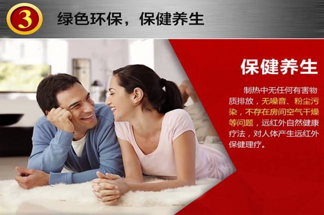 3,保健理疗:碳晶墙暖在制热的同时,向外辐射红外线,医学上称之为“生命光波”;对人体有极佳的保健效果,对病后调理,具有促进康复的作用;还可以改善人体的微循环,促进新陈代谢,提高人体免疫力,有益于健康。