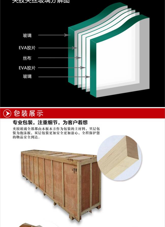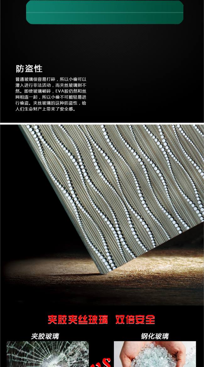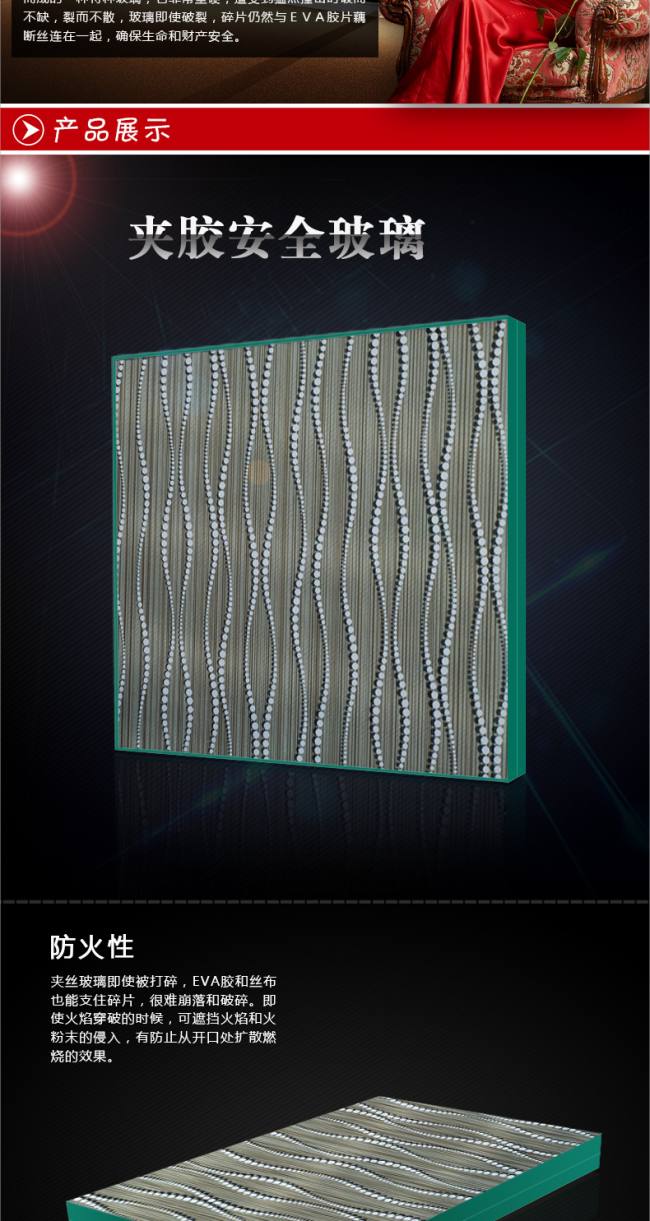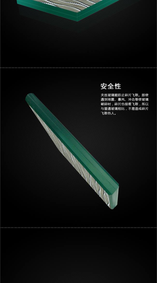 夹丝别称防碎玻璃。它是将普通平板玻璃加热到红热软化状态时,再将预热处理过的铁丝或铁丝网压入玻璃中间而制成。它的特性是防火性优越,可遮挡火焰,高温燃烧时不炸裂,破碎时不会造成碎片伤人。另外还有防盗性能,玻璃割破还有铁丝网阻挡。主要用于屋顶天窗,阳台窗。
