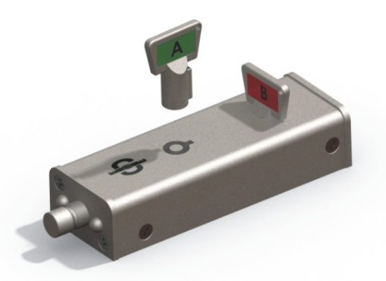 KLT—B(双锁芯):每套装置有两个锁芯, KLP—B(双锁芯):每套装置有两个锁芯, 在锁栓伸出的状态下A钥匙允许拔出,B钥匙锁定; 在锁栓缩进的状态下A钥匙可以拔出,B钥匙锁定; 在锁栓伸出的状态下,A钥匙锁定,B钥匙允许拔出。 在锁栓缩进的状态下,A钥匙锁定,B钥匙允许拔出。 钥匙转换单元 钥匙转换单元是根据客户的具体要求量身定做而成,其通过单元内预设的机械构造来满足客户逻辑操作顺序的要求,既可以插入一把主钥匙后释放多把次钥匙,也可以插入多把次钥匙后释放一把主钥匙,钥匙的数量由客户根据需要确定;同时,本单元亦可与KLT,TLP组成联锁系统,控制一组设备的逻辑操作顺序。