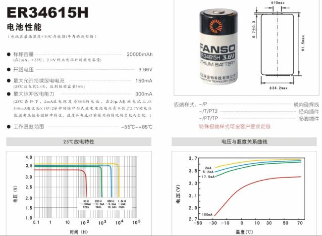我公司锂电池ER34615H/ER34615M性能参数如下: