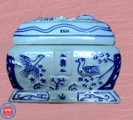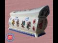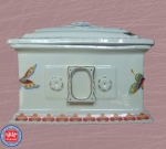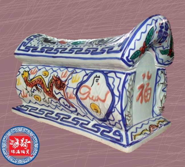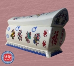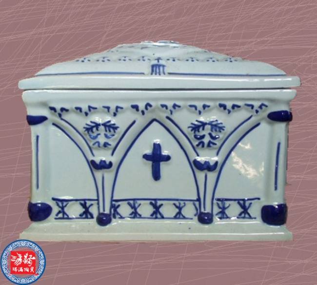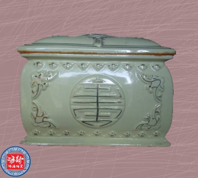 陶瓷骨灰盒由于陶瓷材料来源丰富,廉价,艺术造型容易,易于工业化生产,成本低且产品显得华贵,既适合陈列于殡仪馆和家庭,也适合土葬的民俗,是很有推广意义的一种骨灰盒。它解决了现有的骨灰盒盒体内容易受潮的问题。不易使湿气从盒体或从盒体和盒盖的连接处渗入盒体内,能保证骨灰盒内长时间的干燥。骨灰盒是用来装骨灰的容器。材质:骨灰盒的材质种类很多,有木质,玉石,陶瓷,塑料,水晶,金属等。景德镇陶瓷青花瓷棺骨灰盒丧葬用品抗氧化耐腐蚀防虫蛀千年不烂。