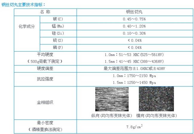 我们严格按美国汽车工程师协会“SAE J441标准”,中华人民共和国机械行业“JB/T 8354-1996钢丝切丸标准”材质要求来生产,但由于采用再生利用钢丝其长度与标准稍有差别。
