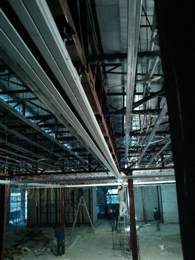 ⑴悬吊式轨道:悬吊导向的固定方式是在隔扇顶面安装滑轮,并与上部悬吊的轨道相连。轨道,滑轮应根据承载重量的大小选用。轻型活动隔断墙,轨道用木螺钉或对拧螺钉固定在沿顶木框或钢框上。重型活动隔墙,轨道用对拧螺钉或焊接固定在型钢骨架上。