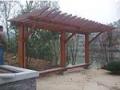 木花架又称木廊架,木长廊,葡萄架。木花架的分类有三种:1.廊式花架:最常见的形式,片版支承于左右梁柱上,游人可入内休息。2.片式花架:片版嵌固于单向梁柱上,两边或一面悬挑,形体轻盈活泼。3.独立式花架:用木格栅,做成墙垣,花瓶,伞亭等形状,用藤本植物缠绕成型,供观赏用。
