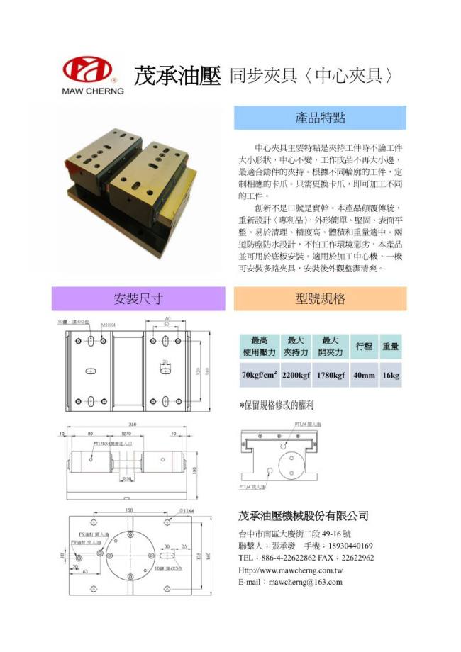 茂承mawcherng油压自定心台虎钳适用于任何金属切削,钻孔,攻牙的加工机械,包括CNC(HMC/VMC)等,具有精度高,体积小,重量轻,夹持范围大和操作灵活等特点,可实现定位和夹紧一步到位。无论工件的大小,或者形状是圆形,方形还是异形,自定心夹持系统总能保证零点位置相同。根据不同的工件,定制相应的卡爪,可握紧轮廓复杂的工件。只需轻松地更换卡爪,即可加工不同轮廓的工件。工件待加工面全部开放, 可以使用标准短刀具。结构简单而坚固,表面平整,易于清理。可做为标准设备上的模块使用。配上茂承油压自定心台虎钳,您的CNC也许不再需要复杂的夹具系统了。茂承油压自定心台虎钳是柔性生产的最佳选择!