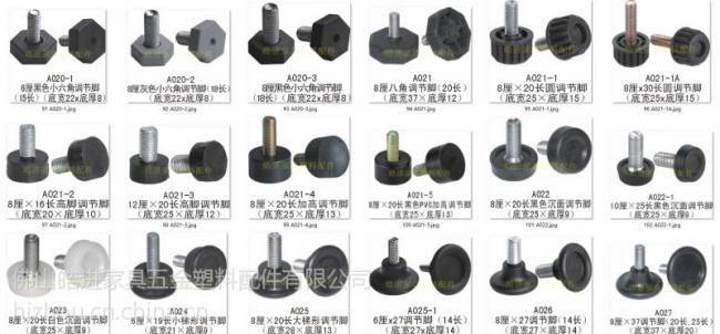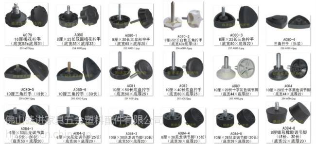 公司名称:佛山皓进家具五金配件厂 主营产品:家具配件 橡胶盖 调节脚 塑料脚垫 弧面管塞,平面管塞,方管管塞,钻石塞,椭圆形管塞,榄形塞,眼睛塞,调整脚,调整钮,轮套塞,弹头塞,华司垫片,鸭嘴,管外塞,管外珠,孔塞,钉塞,壁虎,万向轮,单双套,止滑垫,塑胶圈 公司成立年份:2009