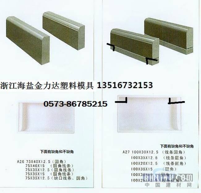 2012新的一年,海盐县金力达塑料模具厂是20多年的老厂,成立于1993年,主为各类工程小型混凝土预制块塑料模具生产厂家,http://www.hyjinlidasm.com位于中国经济最具有活力的长三角经济区——浙江省海盐县百步镇小五金集中营超同园区。现有规格1400多种规格齐全成都雨水篦子塑料模具,南宁高速公路基础边坡下水拱形骨架模具,南京高速公路蝶形水沟塑胶模具,湖南水库六角塑料模具,重庆水库塑胶模具,六盘水六角水库护坡工程塑料模具,贵阳高速公路工程塑胶模具,合肥马鞍山水库锁块塑料模具,珠海高速公路工程模具,鱼平高速工程塑料模具,遵义机场盖板塑料模具,闽侯高速公路混凝土预制块工程塑料模具,安沙高速公路工程塑料模具,六盘水高速公路工程模具,毕节高速公路工程模具,松建高速公路工程模具,龙庆高速公路工程模具,莆永高速公路工程塑料模具,水库六角护坡模具,安徽水库锁扣护坡模具,重庆用高速公路盖板塑料模具,路基拱形骨架护坡塑料模具,城市道路花坛侧石塑料模具,漳州道路工程塑料模具,混凝土工程模具安徽路侧石模具 花坛侧石模具(福建路缘石模具 福建向莆铁路隧道盖板模具,兰渝铁路盖板模具,南京城际盖板模具等等异型模具). 混凝土预制块模具专业水沟盖板塑料模具定点生产单位,2010西部铁路隧道盖板模具 高速公路土建工程护坡正六角塑料模具,高速公路基础拱型护坡塑料模具(2米2.5米3米4米)定点生产企业,开发了上百种路侧石模具).福建高速公路侧石.高速铁路客运专线护栏塑模,福建高速十字护坡模具,安徽水库工字锁块护坡模具,福建高速公路路堤人字型骨架保护预制块塑料模具 路边下水盖板和检查井盖塑模,水库及各种混凝土预制件塑料模具的嘉兴生产厂家,具有专业注塑钢模具设计,开发生产能力。配有先进的各种大型号塑机设备,生产的塑模具有亮度高,韧性强,不变形,易脱模,破损率低等特点!同时我们可根据用户需求定做各种规格的高速公路隧道工程盖板模具,雨水井塑模,雨水篦子塑模,路沿石塑模,漏水盖板塑模,井圈塑模,井盖塑模,窨井塑模,路边石塑料模具,路侧石塑料模具,平缘石塑料模具,路边沟盖塑料模具,水沟盖板塑料模具,路缘石塑料模具,S型防撞石模具 ,高速公路蝶形排水沟侧石模具,水库/河道护坡模具,中空六角护坡模具,铁路客运专线配套预制件工程塑料模具等等异型工程塑料模具。