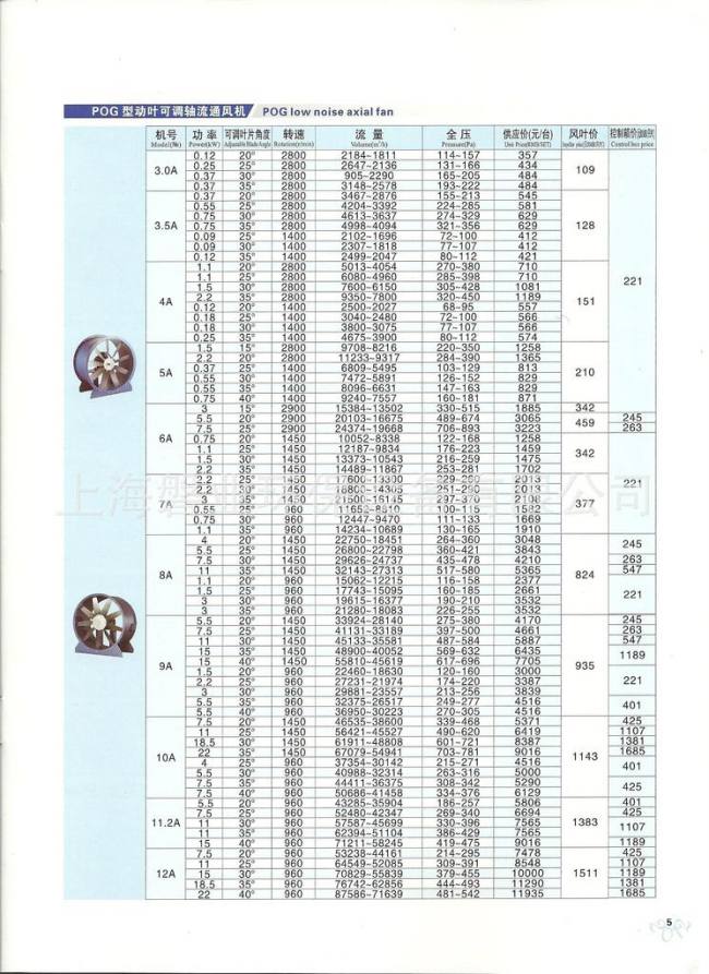 POG叶片可调低噪声轴流通风机技术参数如下: