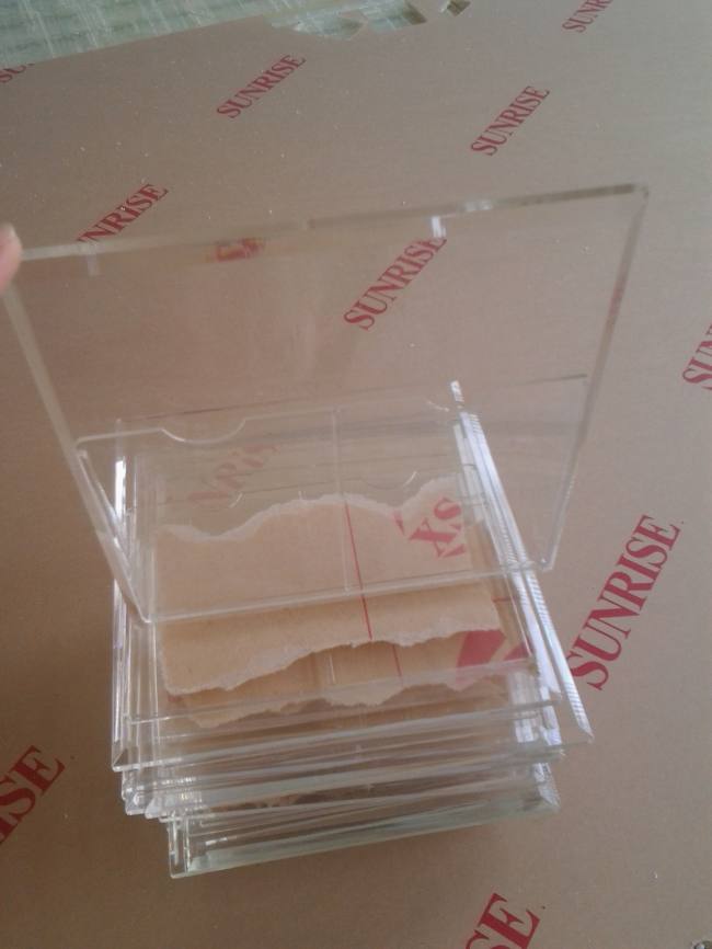 5.粘接:是一个要求非常严格的工艺,先做好定形夹具,把不同的亚克力方块固定好,然后顺着接口处打有机玻璃胶水,千万别让胶水四处流哦,不然,工艺就不精致了。过十多分钟后,胶水干透,产品成形OK。