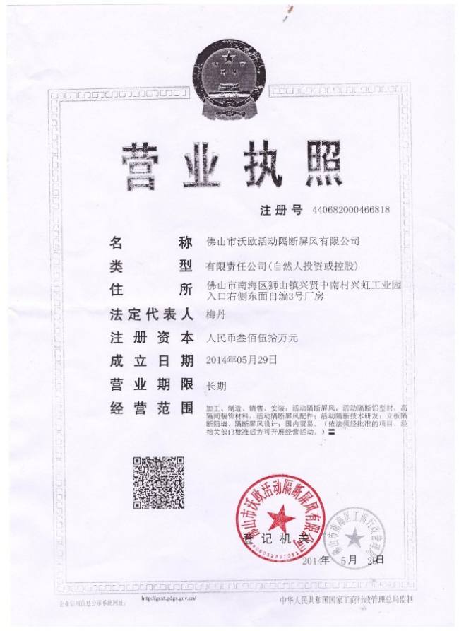 沃欧活动隔断所生产的产品被建设部中国建筑装饰协会建筑五金委员会审核认定为“工程建设选用产品”,“中国名优产品”,“质量信得过产品”,产品获多项“国家外观及实用新型设计”专利。