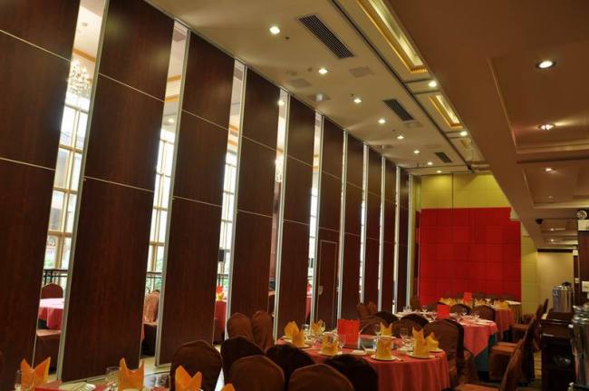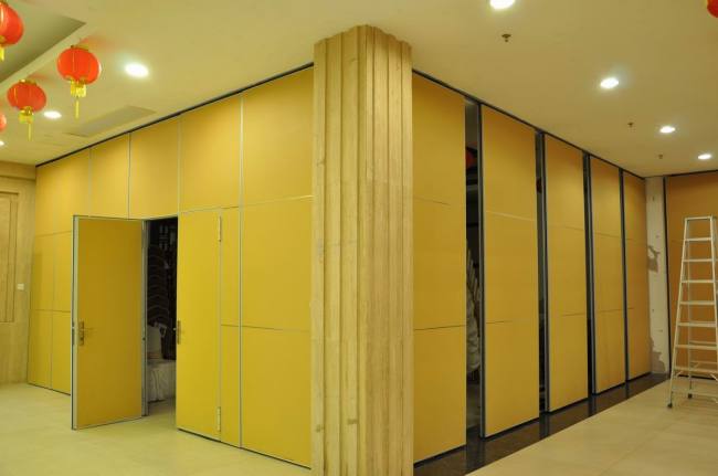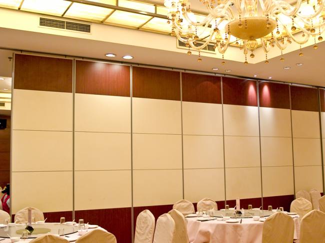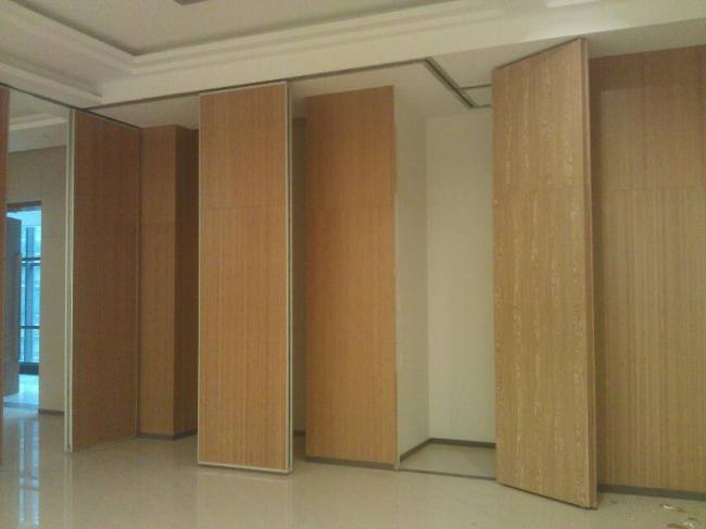 产品信息:隔断厚度为65㎜,有单片式和双片式之分,可开设U型和L型门中门,每片屏风轨道最大负载为225㎏,顶底伸缩范围为22.5㎜。