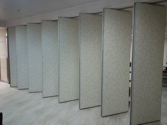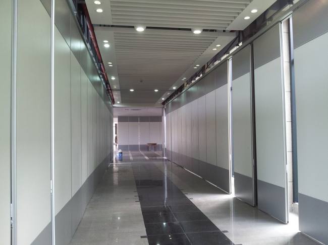 产品信息:隔断厚度为100㎜,有单片式和双片式之分,可开设U型和L型门中门,每片屏风轨道最大负载为650㎏,顶底伸缩范围为22.5㎜。