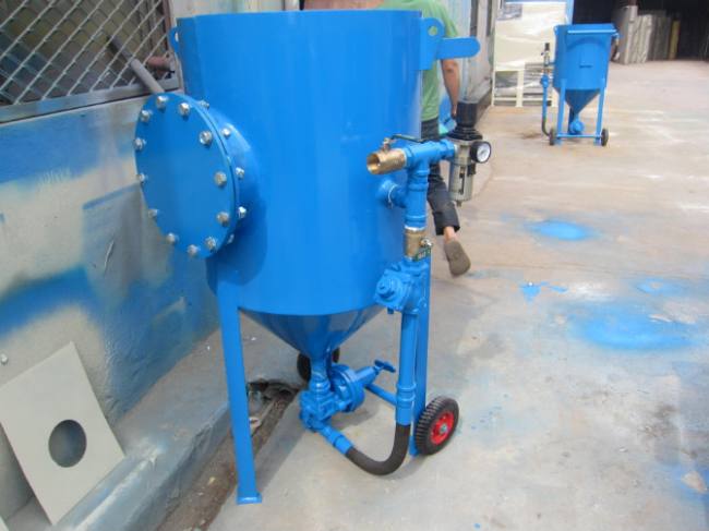 本机采用压送式喷砂(喷丸)机构,即利用压缩空气在高压罐内高速流动行成高压作用,将高压罐内的砂料通过输砂管喷出,然后随压缩气流由喷枪嘴高速喷射到工件表面,达到喷砂加工的目的。