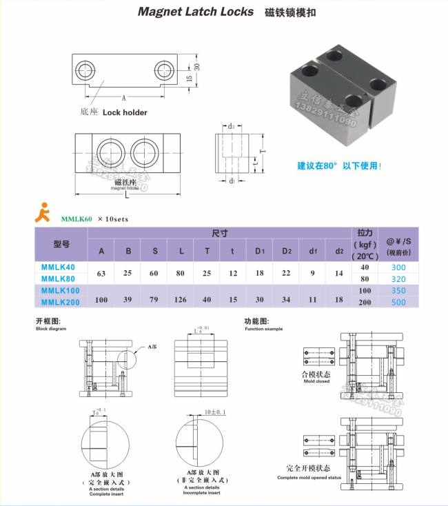 磁力开闭器—是针对使用频繁的三板模而设计的。在现今三板模中的定模模板与动模模板之间普遍使用的有机械开闭器与尼龙开闭器,机械开闭器主要依赖弹簧的弹力锁模达到控制三板模开模的先后顺序;尼龙开闭器主要靠尼龙本身的摩擦力来控制三板模开模的先后顺序;其制造工艺复杂,加工时间长,精度要求极高,且稳定性不强,使用寿命短。而磁力开闭器主要是利用二个磁力锁模块之间产生的永磁力来控制三板模开模的先后顺序,安装简单,方便,快捷。磁力开闭器只需安装在模具的定模模板与动模模板侧面,无精度要求,不需在定模模板与动模模板表面加工,有效节省模具材料,缩短了模具的制造周期,对模具的精度毫无影响。是代替机械开闭器和尼龙开闭器更佳锁模产品。