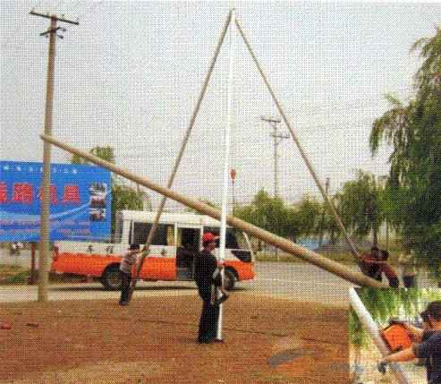 铝合金立杆机采用天津铝合金厂生产的高级原材料,通过本厂技术人员多年的开发,研制,现以正式投放市场,该产品体积小,重量轻,应用灵活,方便保险,系数高,解决了吊车不能进行的场地及人工立杆危险性的难题(半山区丘陵地带施工)更能体现其特点,整套立杆过程只需几个人在短暂的十几分钟内完成。