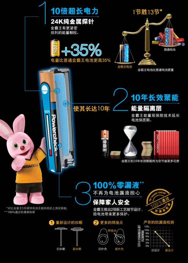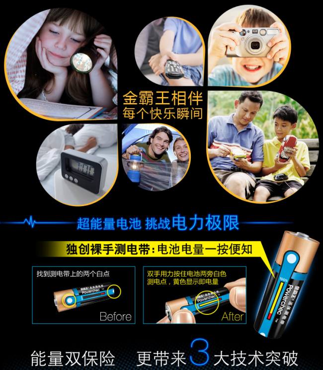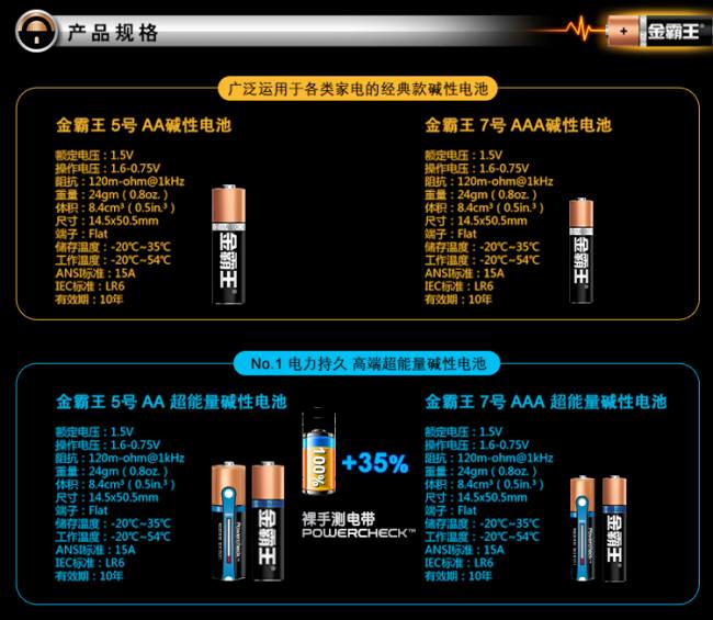 金霸王电池是世界上制造和销售高效碱性电池的领先企业,是世界上最知名卓越的消费品品牌之一。对于世界各地的人们来说,“金霸王”这个品牌代表了高品质的电池产品和不断创新,进取的销售理念。金霸王碱性电池以其“卓越品质,持久电力”的出众品质行销全球近百个国家和地区。