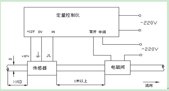 二,工作原理:通过流量计提供流量信号给控制仪表,在控制仪表面板上设定定量值,达到设定定量之后,自动关闭电磁阀,水泵等。可同时控制电磁阀,水泵,也可单独控制。