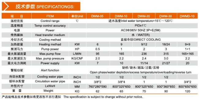 水加热器,快速水温加热器,超高温水温机相对于油温控制系统而言,使用水作为媒体有其优势:热传导效率高,污染少,水资源容易取得,但其控温范围小,最高只有98℃。我司最新研制的一款超高性能水温机,150度水温机,针对注塑行业及电子行业的超高精度控温设备,控温范围达到150℃,更最新研制控温精度上已达到±0.1℃机型(适用镭射碟片生产),使水温机的运用有了更广阔的空间。
