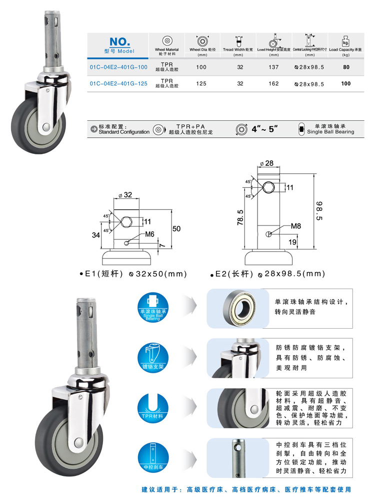 长杆二档中控刹脚轮 轮径100mm,125mm两段中央控制轮配有中心锁定,全锁定或定向锁定的旋转脚轮,精密滚珠轴承内置于两个轮子中配有合成轮盖的轮架。五金镀铬主架和轮芯,承载能力强TPE轮面,有极好的降噪减震作用,安全可靠。适用锁定控制杆配有凸轮孔的轮杆。