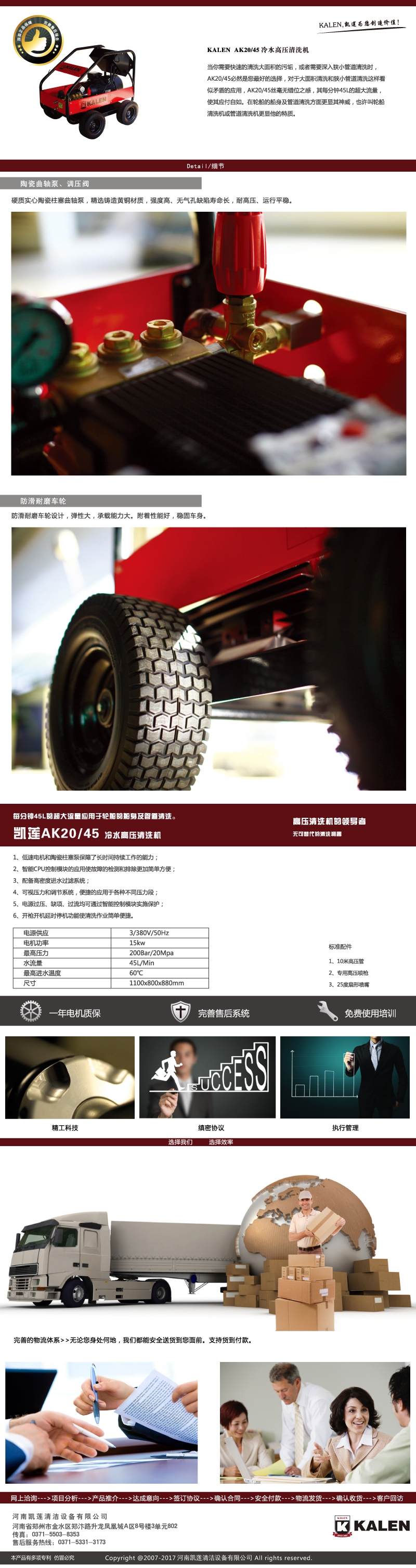 AK20/45大流量冷水高压清洗机,高性能四级低速三相电机和意大利高精度工业陶瓷柱塞曲轴泵提供200bar的操作压力和45L/min的大水流量适用于各类清洗作业,配有高密度进水过滤系统,可视压力和调节系统,压力保护系统,缓冲启动系统,电源过压,缺相和过流保护系统,和延时自动停机系统。紧凑的加固钢结构和重载轮胎设计方便移动,适用于多种应用场所的顽固污渍清洗和工艺流程清洗。 |