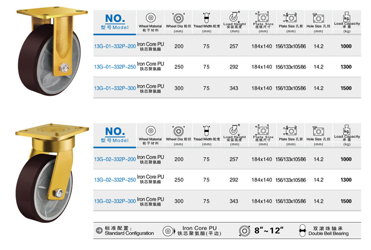 供应超重型铁芯聚氨酯抗冲击防撞脚轮参数: