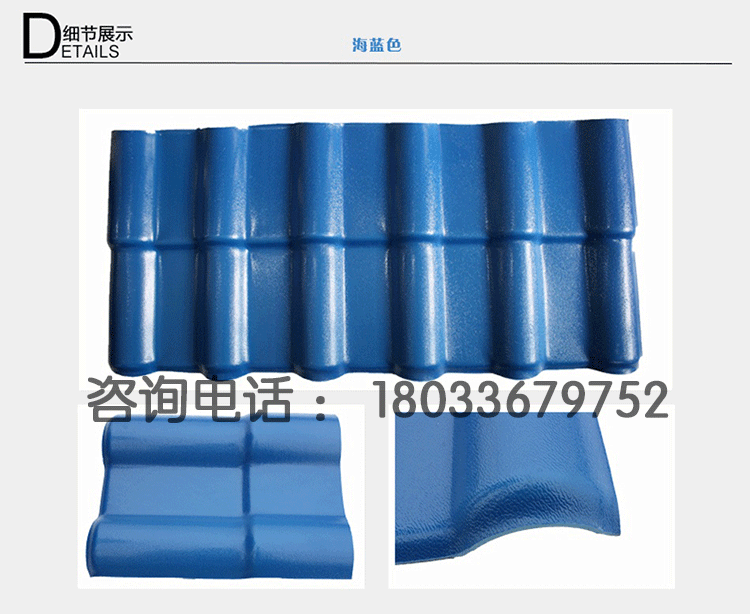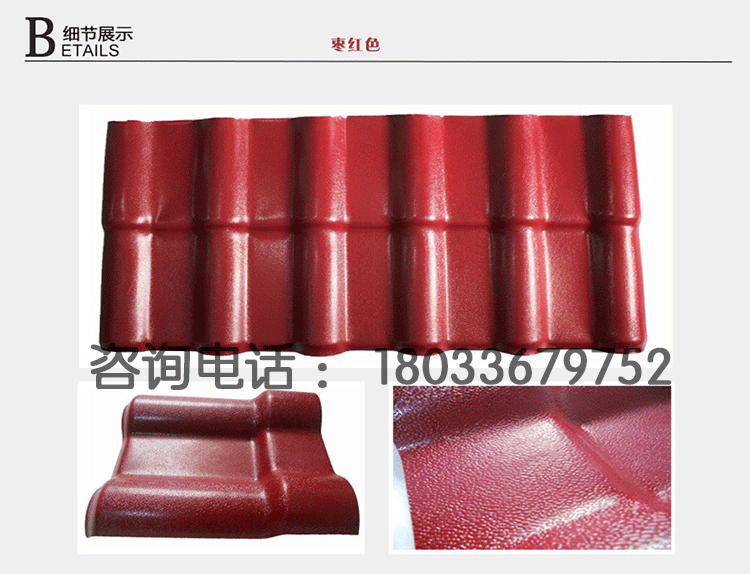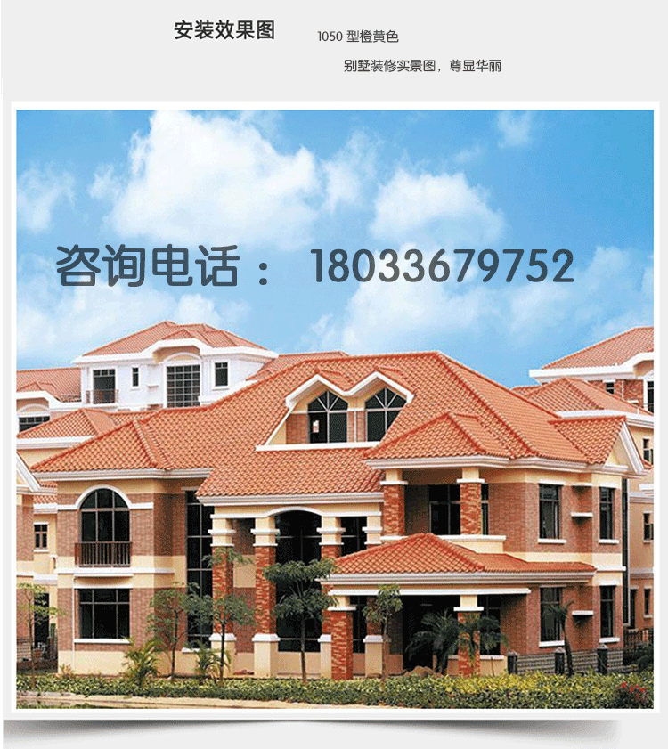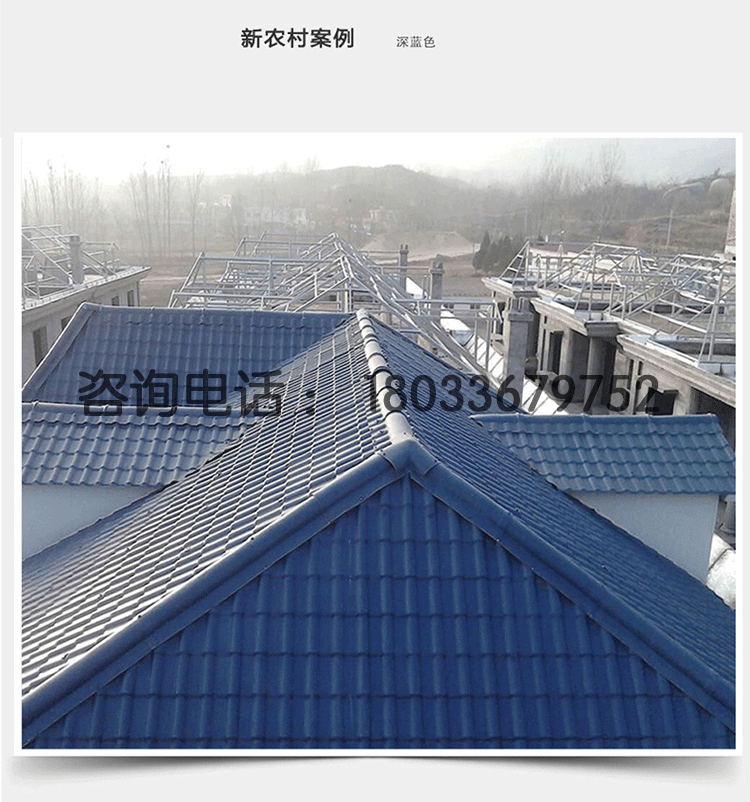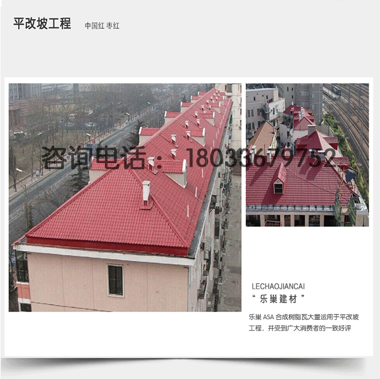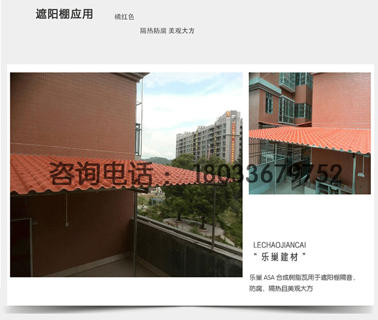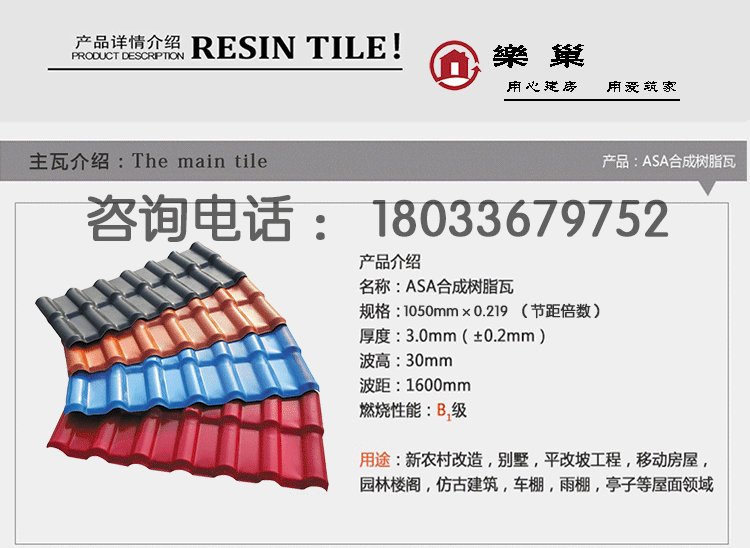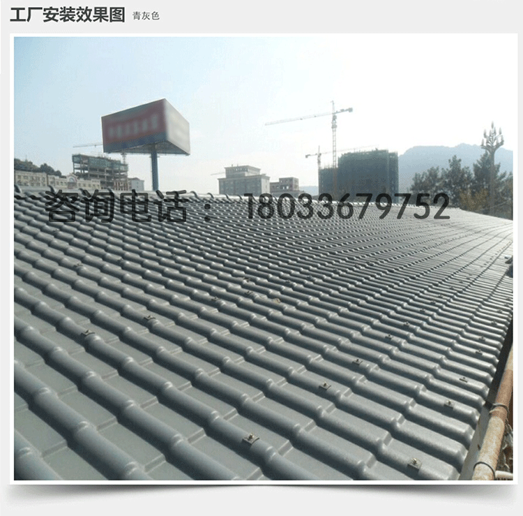 合成树脂瓦具有颜色持久,质轻,自防水,坚韧,保温隔热,隔音,耐腐蚀,抗风防震,抗冰雹,抗污,绿色环保,防火,绝缘,安装方便等优点,而且造型美观立 体感强,颜色极具中国元素,使得它被广泛应用于各类永久建筑屋面装饰,尤其目前国内大力推广的“平改坡”工程。普遍适用于开发区平改坡,农贸市场商场,商场,住宅小区,新农村建设居民别墅,雨篷,遮阳篷,仿古建筑等。