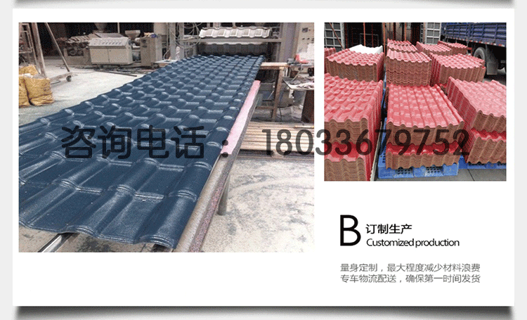 由于树脂瓦的厚度和颜色不同,在定做的时候需要重新配置原料和颜色,所需定做时间根据数量大小一般大概在1-3天便可出货。