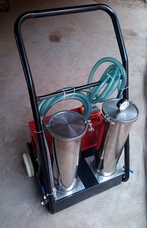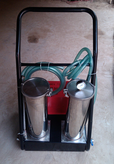 进入粗滤罐进行初级过滤,将大颗粒的杂质和水滤出,再由齿轮泵加压后打入细滤罐将细小