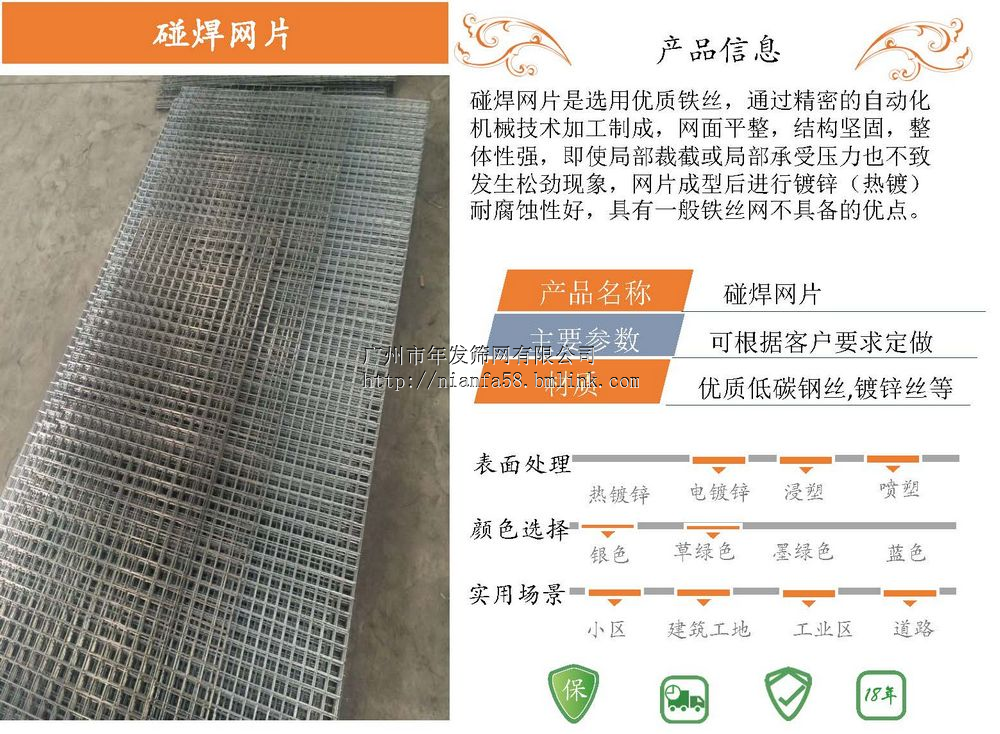 特点:采用优质低碳钢铁丝排焊而成,然后再冷镀(电镀),热镀,PVC包塑等表面钝化,塑化处理,网面平整,网目均匀,焊点牢固,局部机加工性能良好,稳定,防腐,防蚀性好。表面处理一般有冷镀锌,热镀锌,PVC涂塑,颜色和规格多样化,一般选择现货销售,特殊规格可按用户要求加工定做。