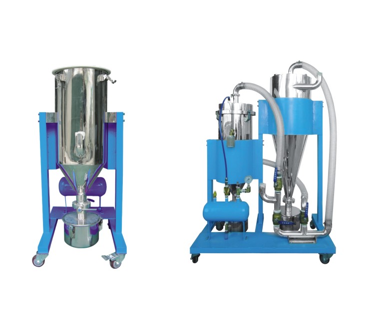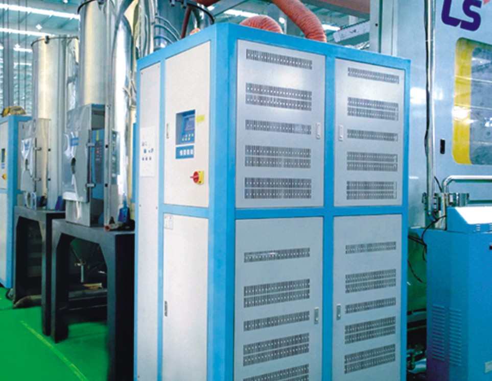 注塑集中上料系统的组成及图片:中央控制台,旋风集尘器,高效能过滤器,风机,分支站,干燥料斗,除湿机,选料架,微动料斗,电眼料斗,截风阀,截料阀