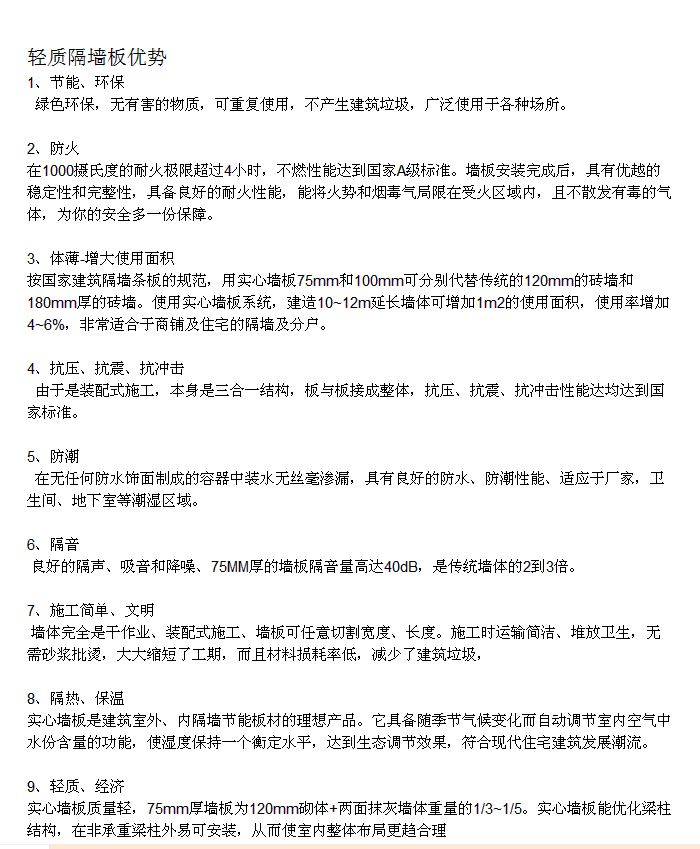 地板等)3.办公场所的应用:(轻型墙体,隔断,会议室,录音棚,演播室等)4.工业场所应用:(厂房墙体,屋顶,设备,门,控制室等)产品特点:环保无异味,对低频和高频声音均有相当好的抑制作用,能有效地抑制各种振动的传播。高隔音性,柔韧性好,隔热,抗冷,阻燃,自熄。佛山壁迅陶粒隔墙板材诞生标志着墙体材料