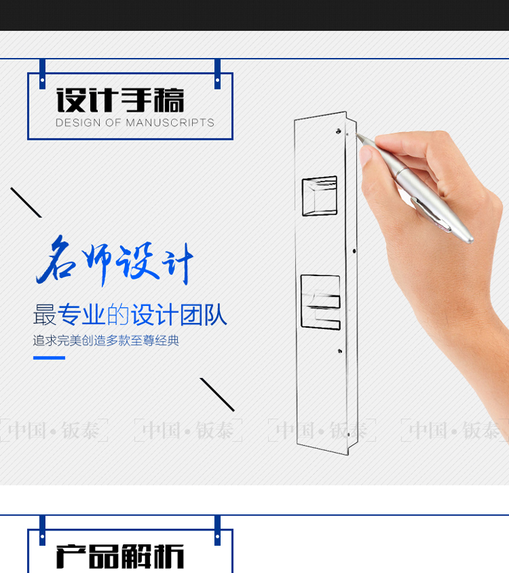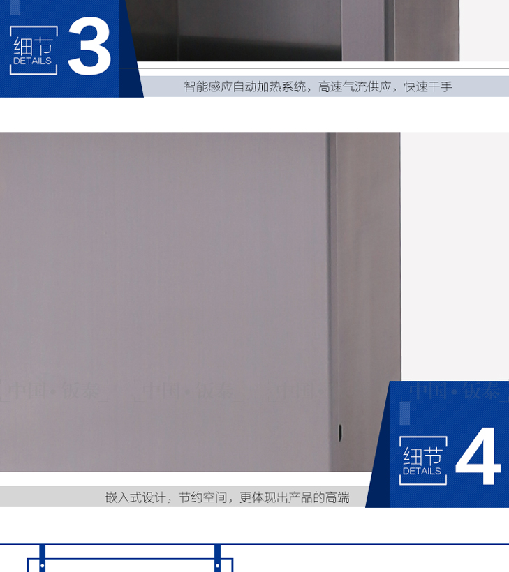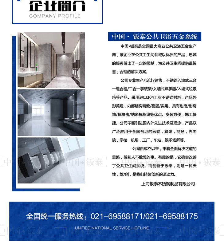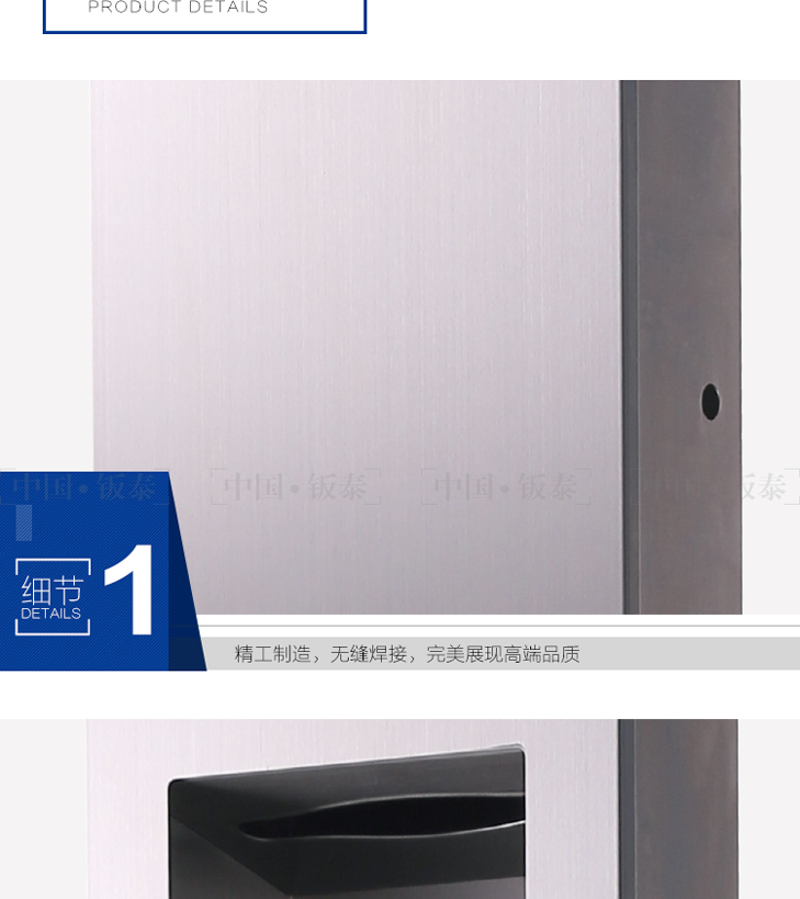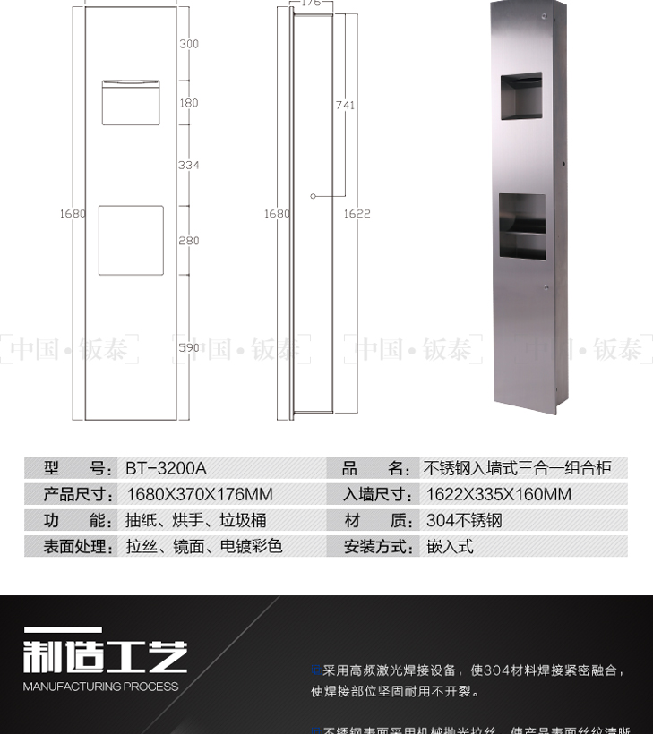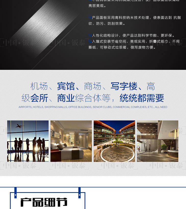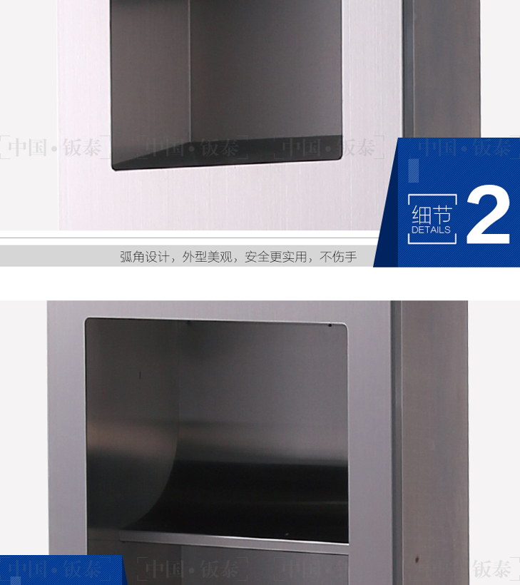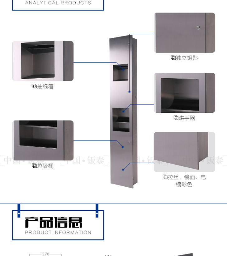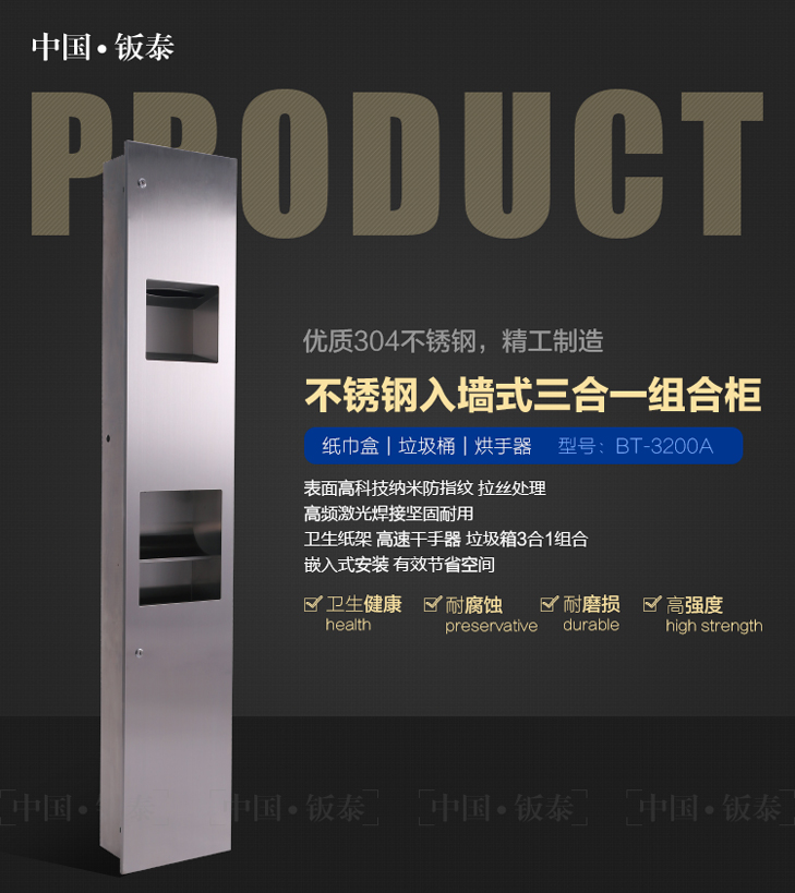 手纸架/入墙式烘手器/入墙式垃圾箱等产品。采用进口304工业不锈钢材料,产品外形美观,内部结构精致/稳固/实用。具有耐磨/耐腐蚀/抗撞击/纳米抗指纹等优点。安装方便,施工快捷。公司不断引进国内