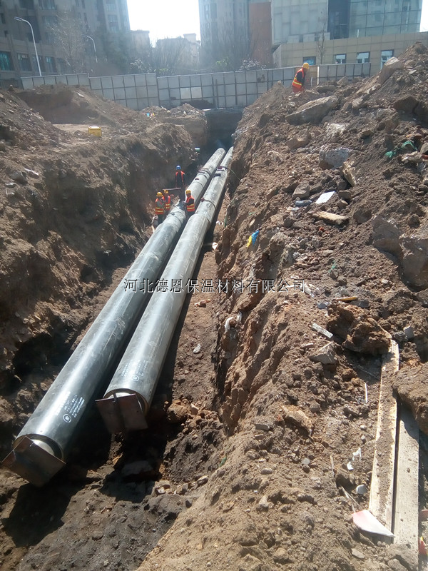 第二层:聚氨酯保温层,用高压发泡机在钢管于外护层之间形成的空腔中一次性注入硬质聚氨酯泡沫塑料原液而成。即俗称的“管中管发泡工艺”。其作用一是防水,而是保温,三是支撑热网自重。【其保温层厚度为30mm-150mm】;当输送介质温度为:-50℃—120℃时,选用硬质塑料做保温层。