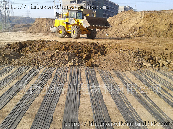 土工筋带表面延压成具有规则的粗花纹呈网络状,铺设于地基的换填材料中,承受拉应力和摩阻力,形成加筋复合垫层。