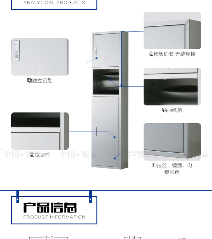 手纸架/入墙式烘手器/入墙式垃圾箱等产品。采用进口304工业不锈钢材料,产品外形美观,内部结构精致/稳固/实用。具有耐磨/耐腐蚀/抗撞击/纳米抗指纹等优点。安装方便,施工快捷。公司不断引进国内