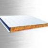 新型防火聚氨酯封边岩棉夹芯板是选用两层高品质的彩色涂层钢板或其他精密压型的金属板材做面板,压制成型后,将分条后的岩棉90°翻转(使其纤维垂直于上下两层钢板