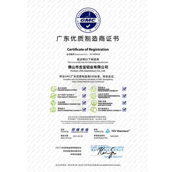铝世家品牌是在国家商标局成功注册的广东本土品牌,拥有多项质量检验机构权威认证,包括ISO9001:2008认证,德国莱恩TUV认证,国际认证联盟IQNET认证,CQM质量管理体系认证,中国315质量公信网认证等。