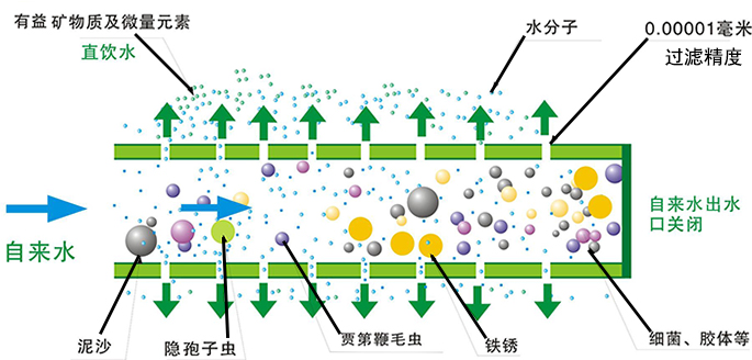 | 4、 | 高效去除水中,泥沙、铁锈、细菌、病毒、高分子有机物。 |