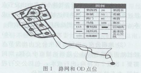 (2)地面公交。出行者乘坐公交由出发节点经过地面道路和高速公路到达城市中心区,期间需要1次或2次换乘,出行成本c。包括公交行程时间、在车站的候车时间以及公交票价。