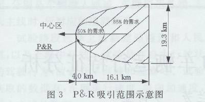 根据西雅图城市外围巴士停车换乘设施调查数据报告,当包含85%的停车换乘设施使用者,吸引区为抛物线形状,从换乘设施起下游可达3. 2~4.5 km,上游吸引范围则远至16.1 km,远端弦长19.3 km;当仅包含50%的换乘设施使用者,吸引区为半径4.0km的圆,见图3。根据表3可知,南门、老城和菊园东这3个区域中心点与嘉定西站的直线距离分别为2.4,2.1和3.9 km,这3个小区位于50%吸引圈内,停车换乘使用比例相对较高;菊园西与嘉定西站的距离只有0.3km,适合步行换乘地铁;而马陆、南西和南东又与嘉定西站相距过远,分别为7.2,5.9,4.2 km,且位于停车换乘设施点下游,因此这3个小区的停车换乘比例将近为0。仿真结果在一定程度上印证了学者们关于P&-R设施吸引范围的研究。
